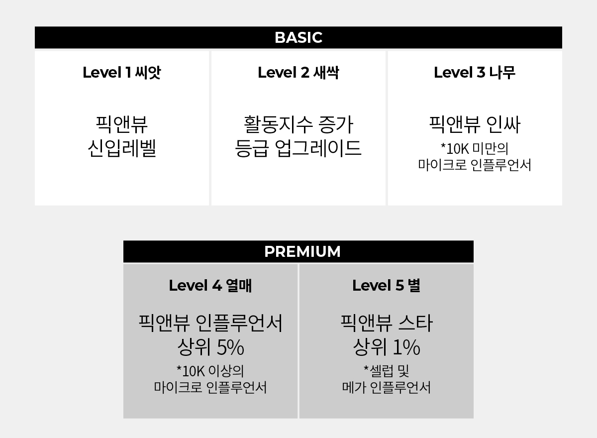 픽앤뷰는 리뷰 작성, 커뮤니티 활동 지수(좋아요/댓글 참여)에 따라 등급제로 운영되며 이에 따라 체리피커 유저를 필터링하고, 등급에 따라 더 혜택이 많은 캠페인에 참여할 수 있는 차등적 기회가 주어집니다.