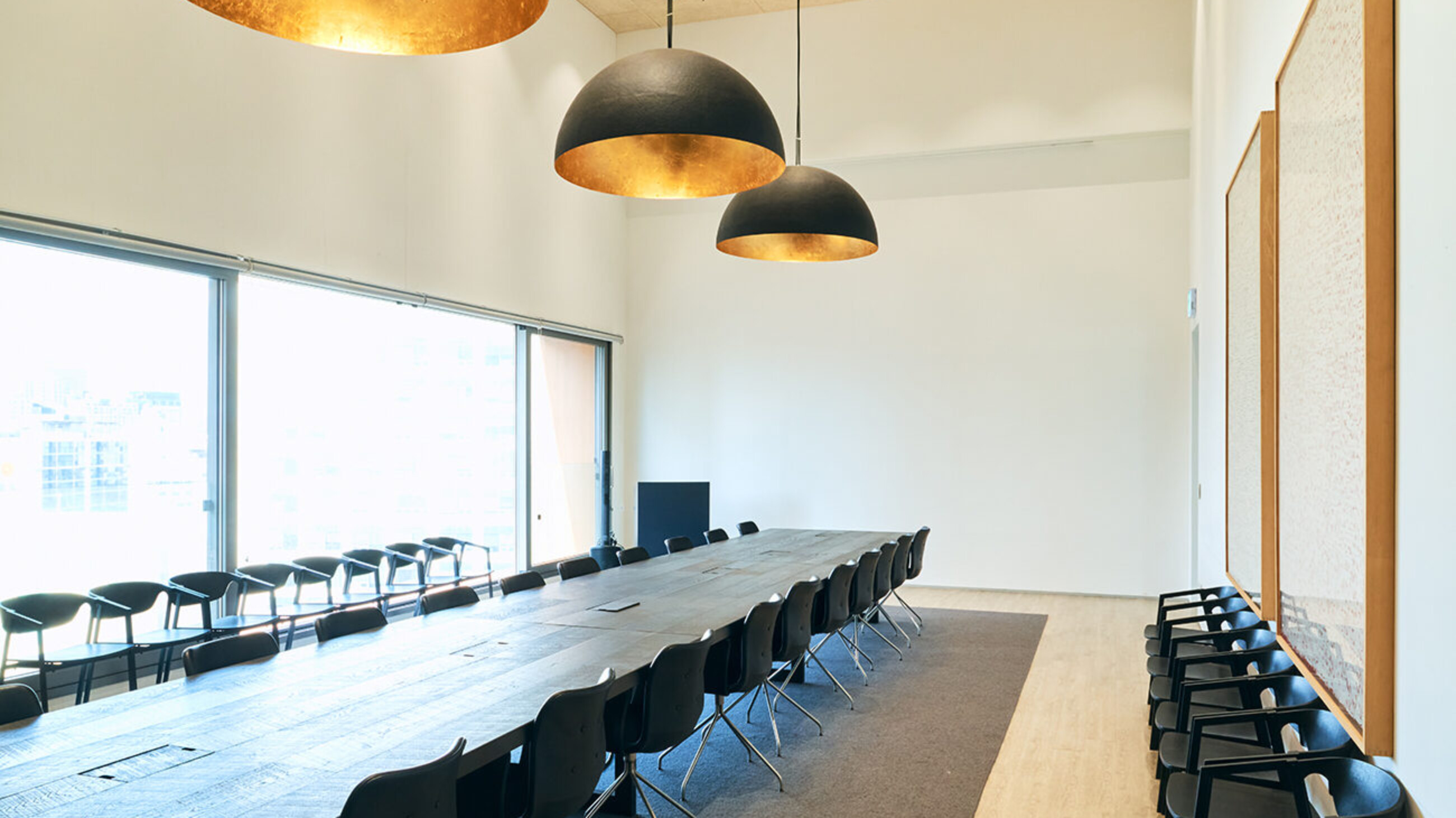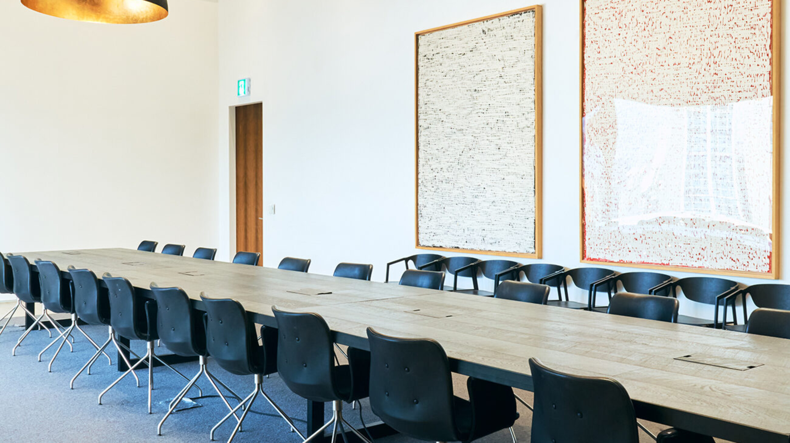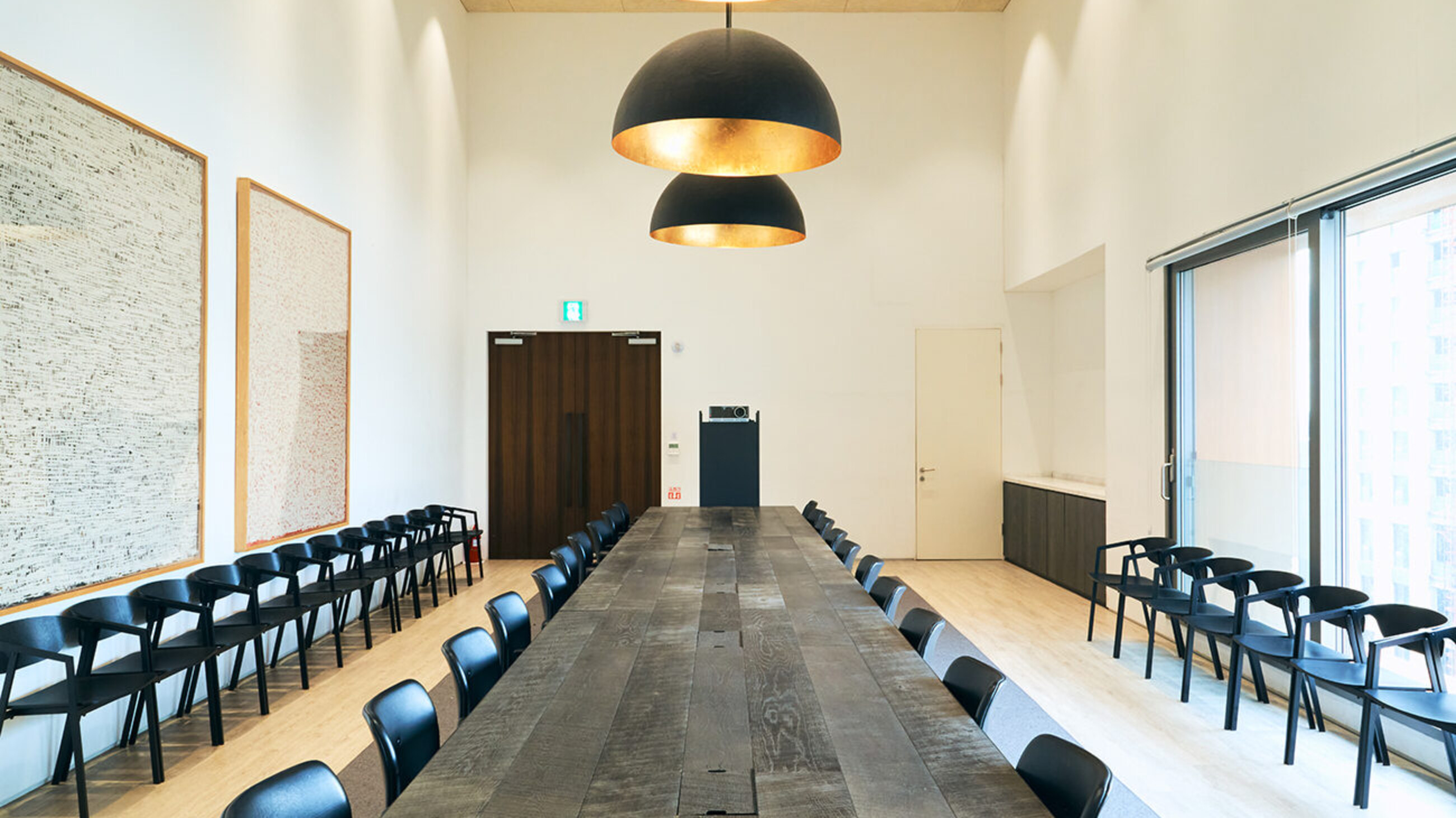 편안한 좌석과 긴 테이블을 갖춘 모던한 분위기의 회의실