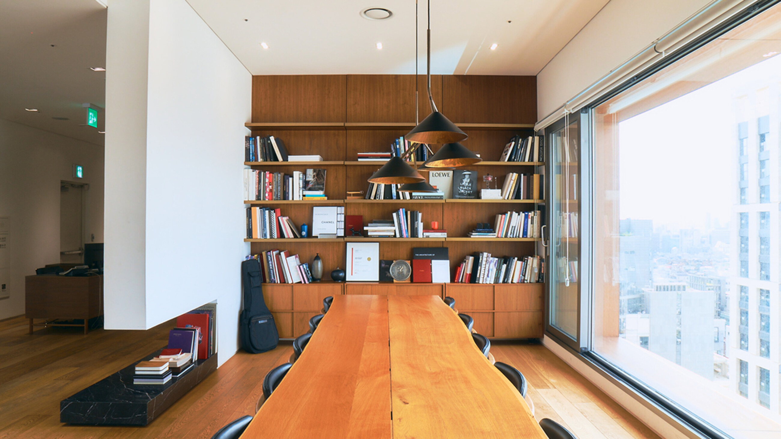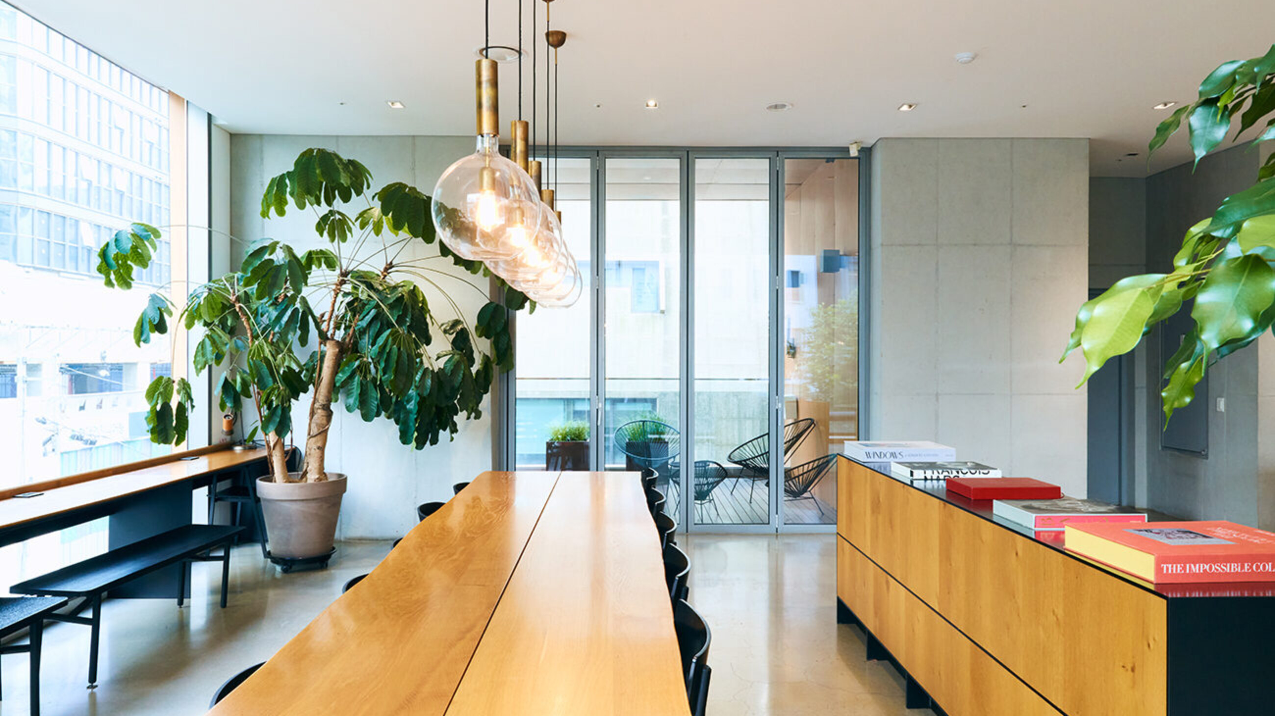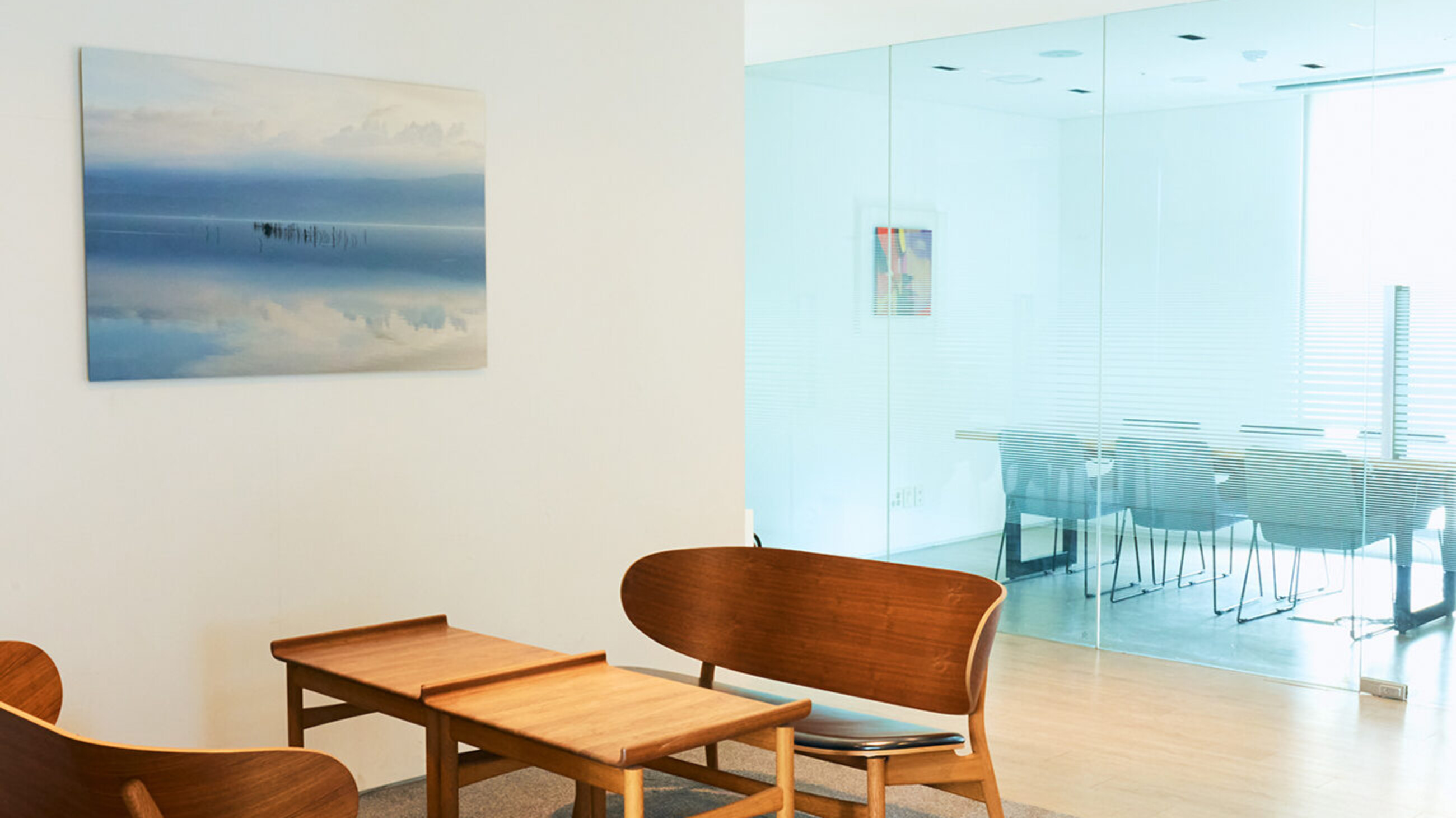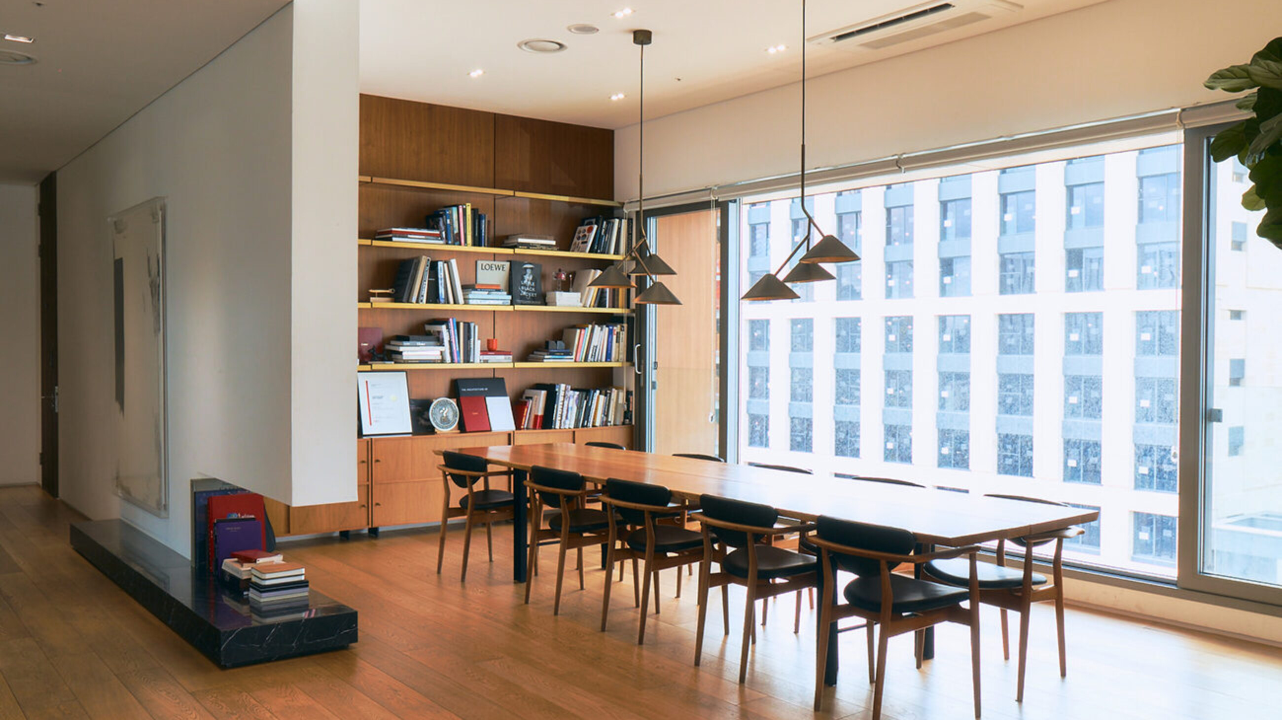편안한 좌석과 긴 테이블을 갖춘 모던한 분위기의 회의실