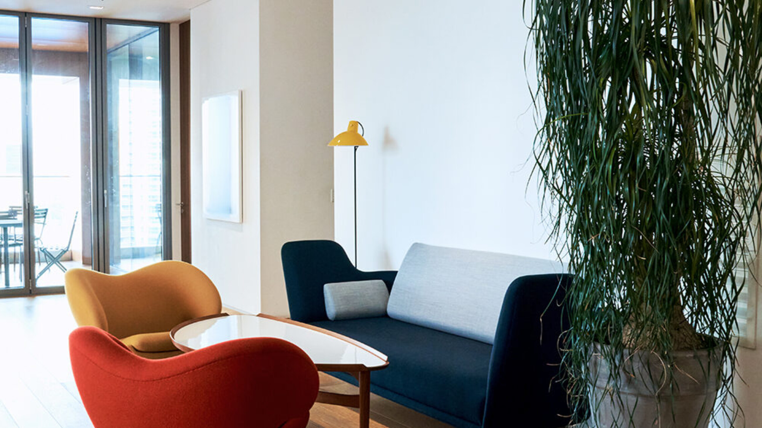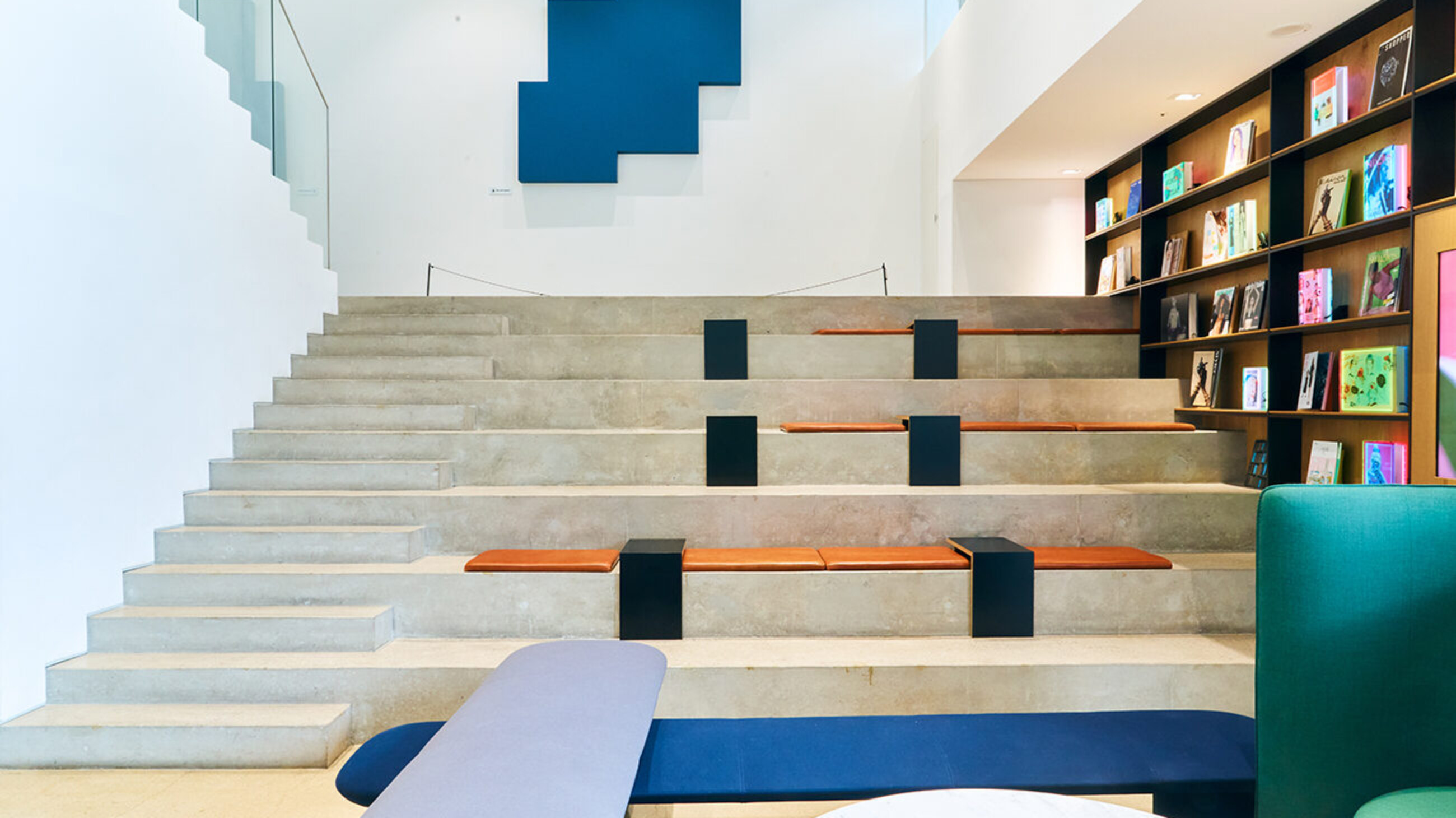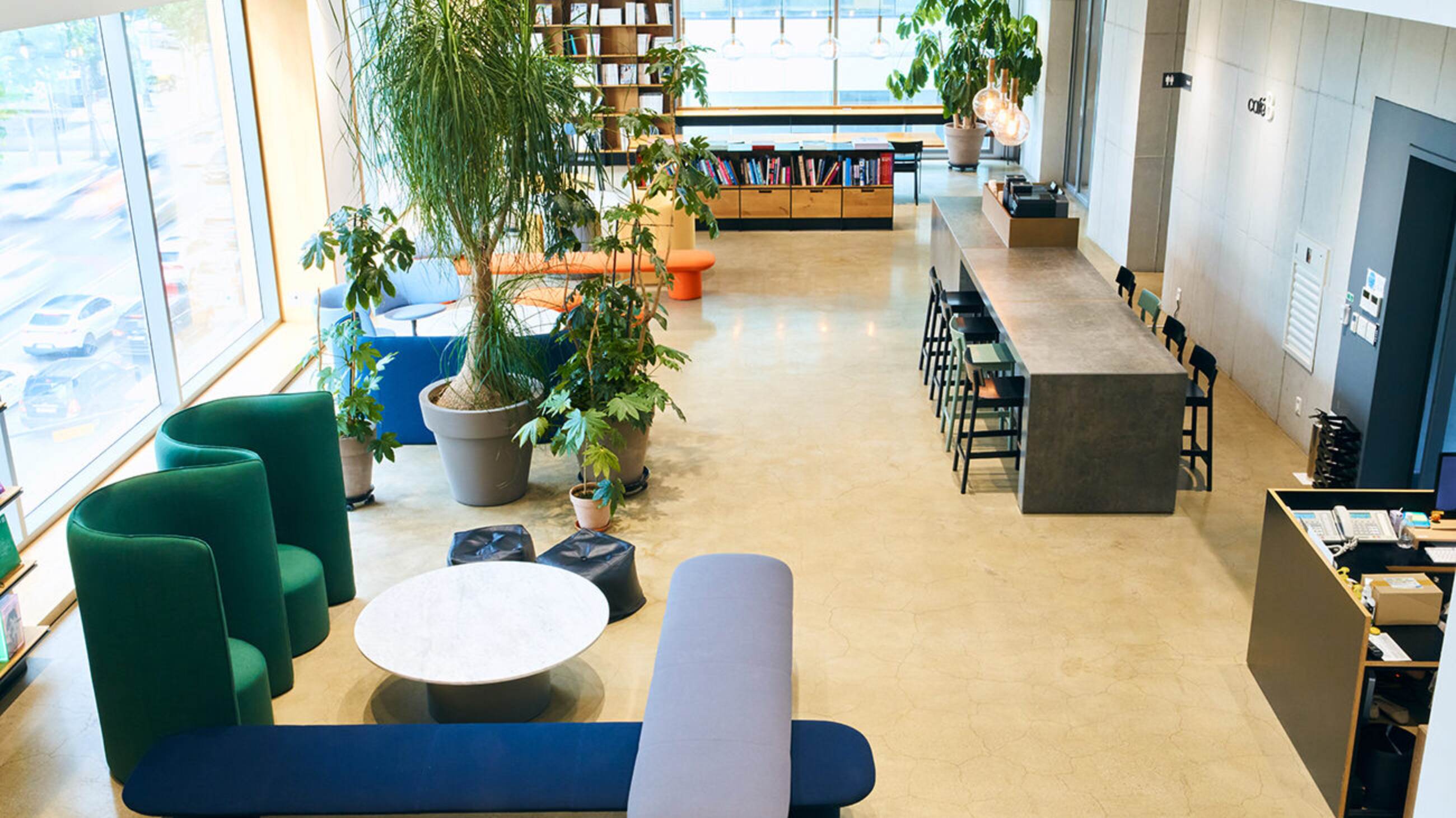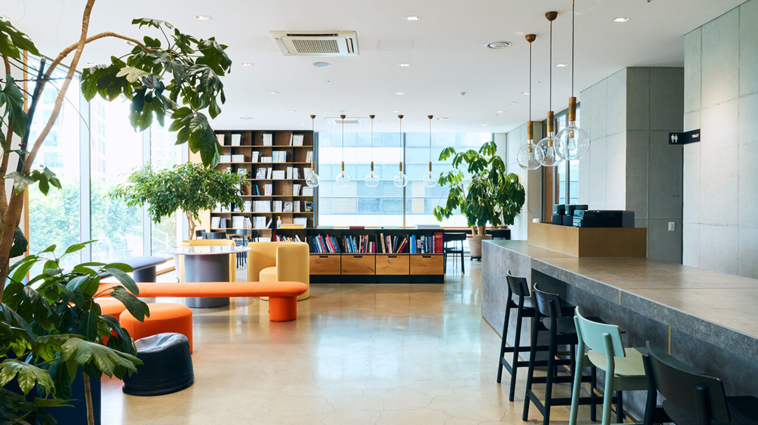 통유리와 높은 천고로 개방감이 느껴지는 카페형 라운지