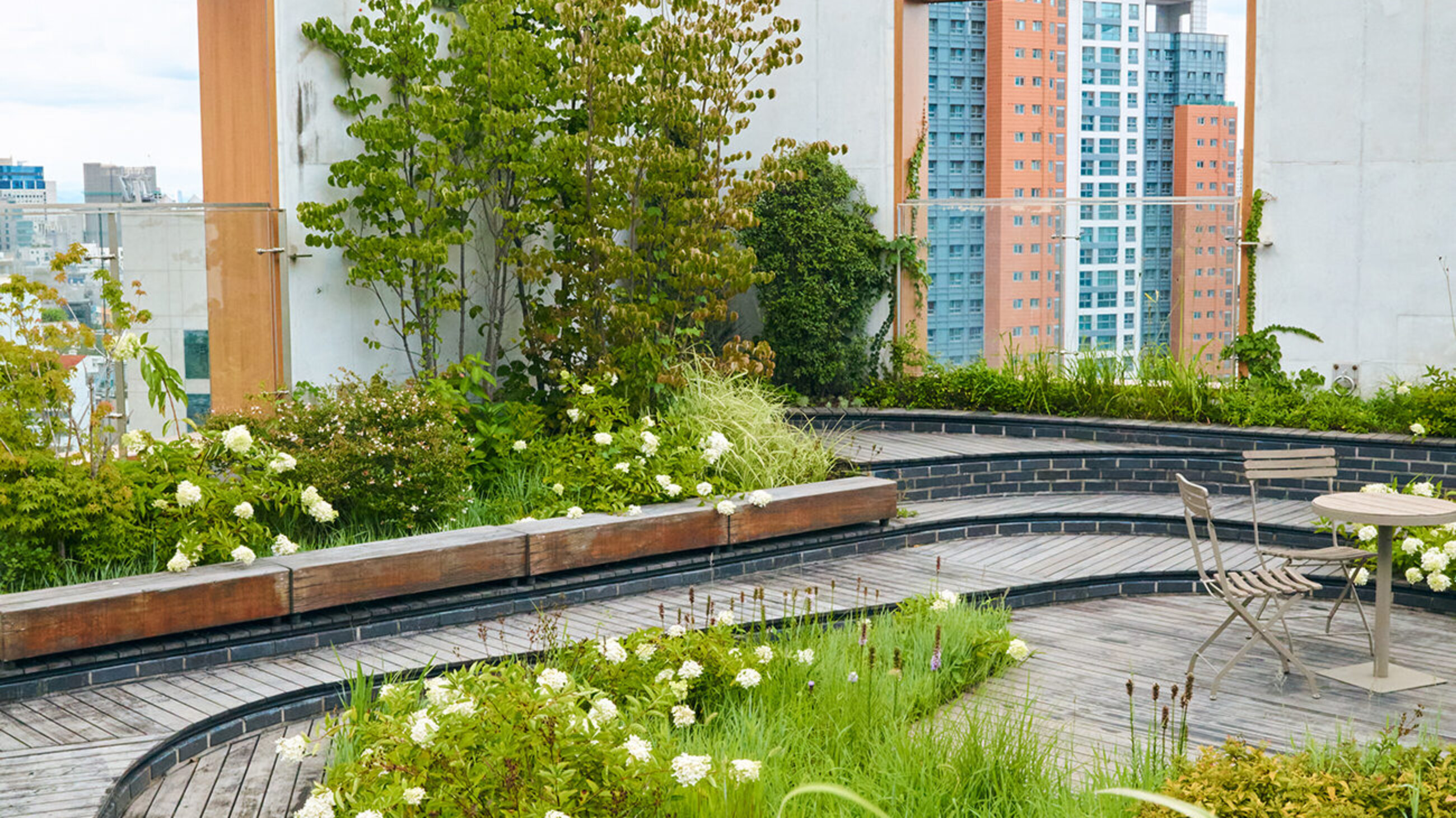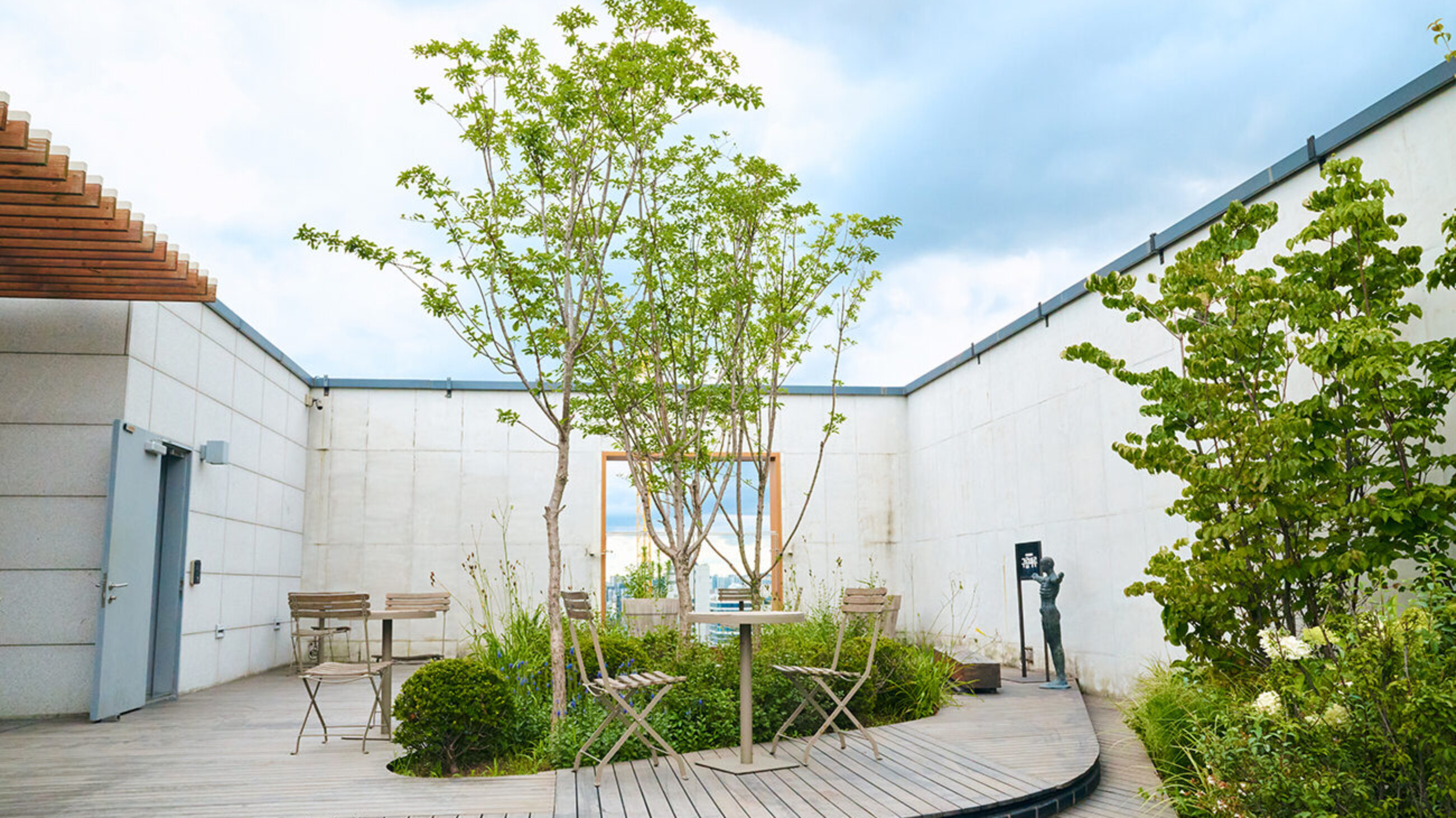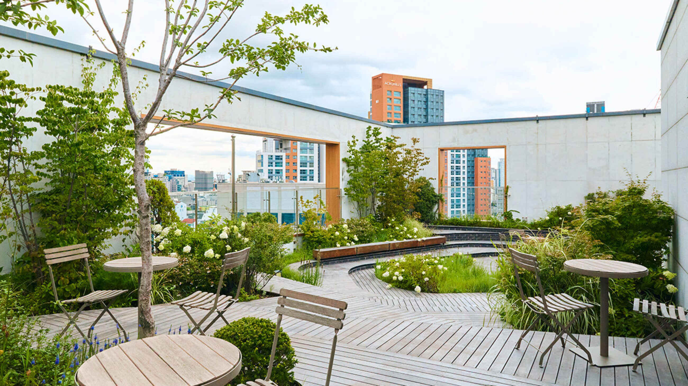원형 탁자와 의자가 갖춰진 탁 트인 시야의 루프탑 가든