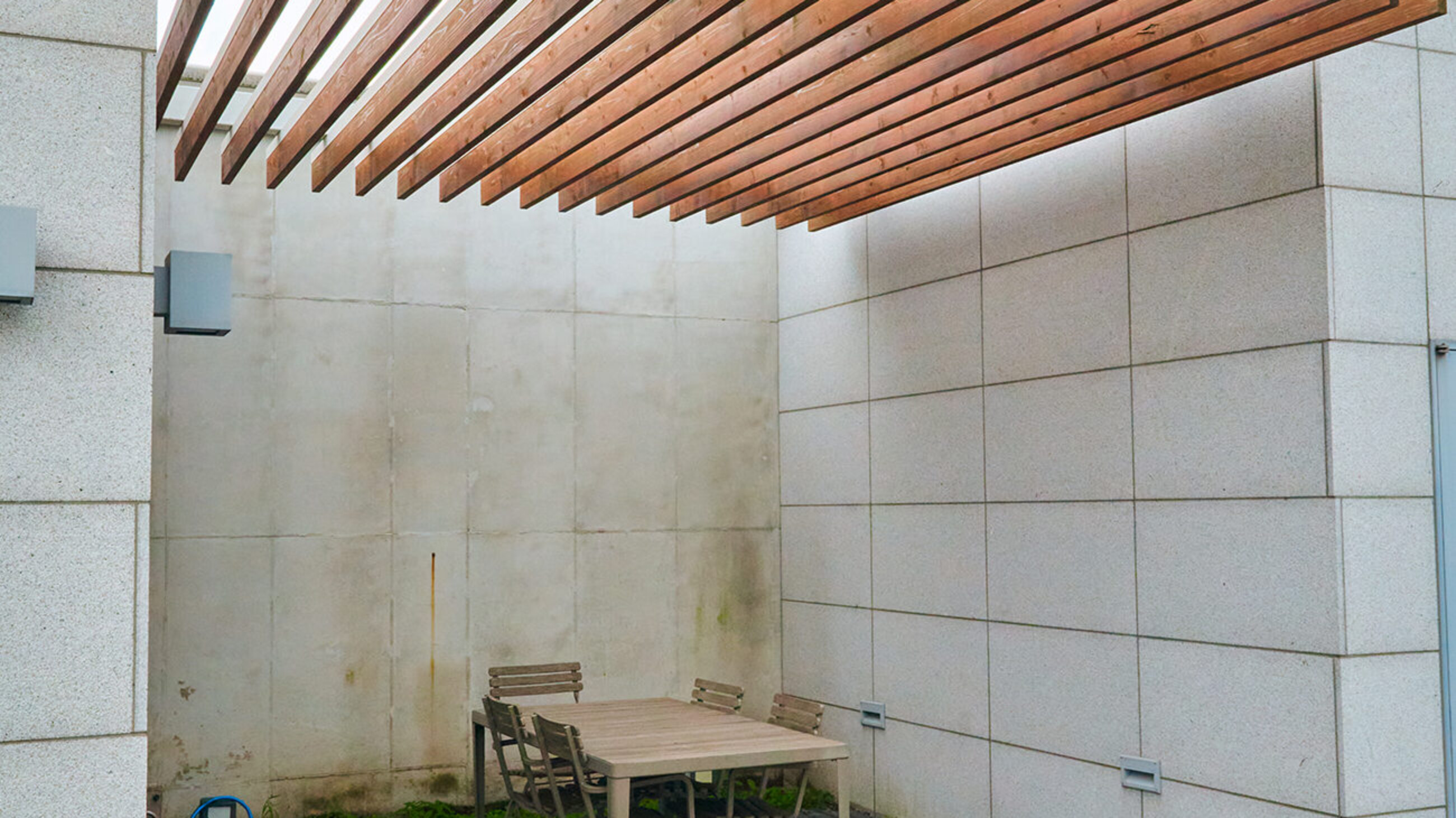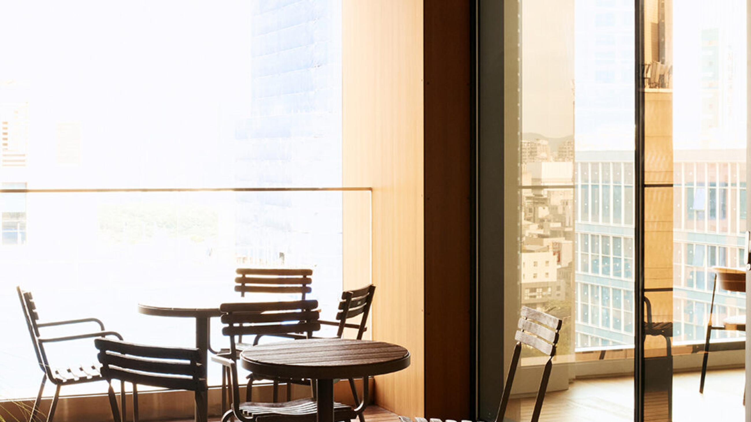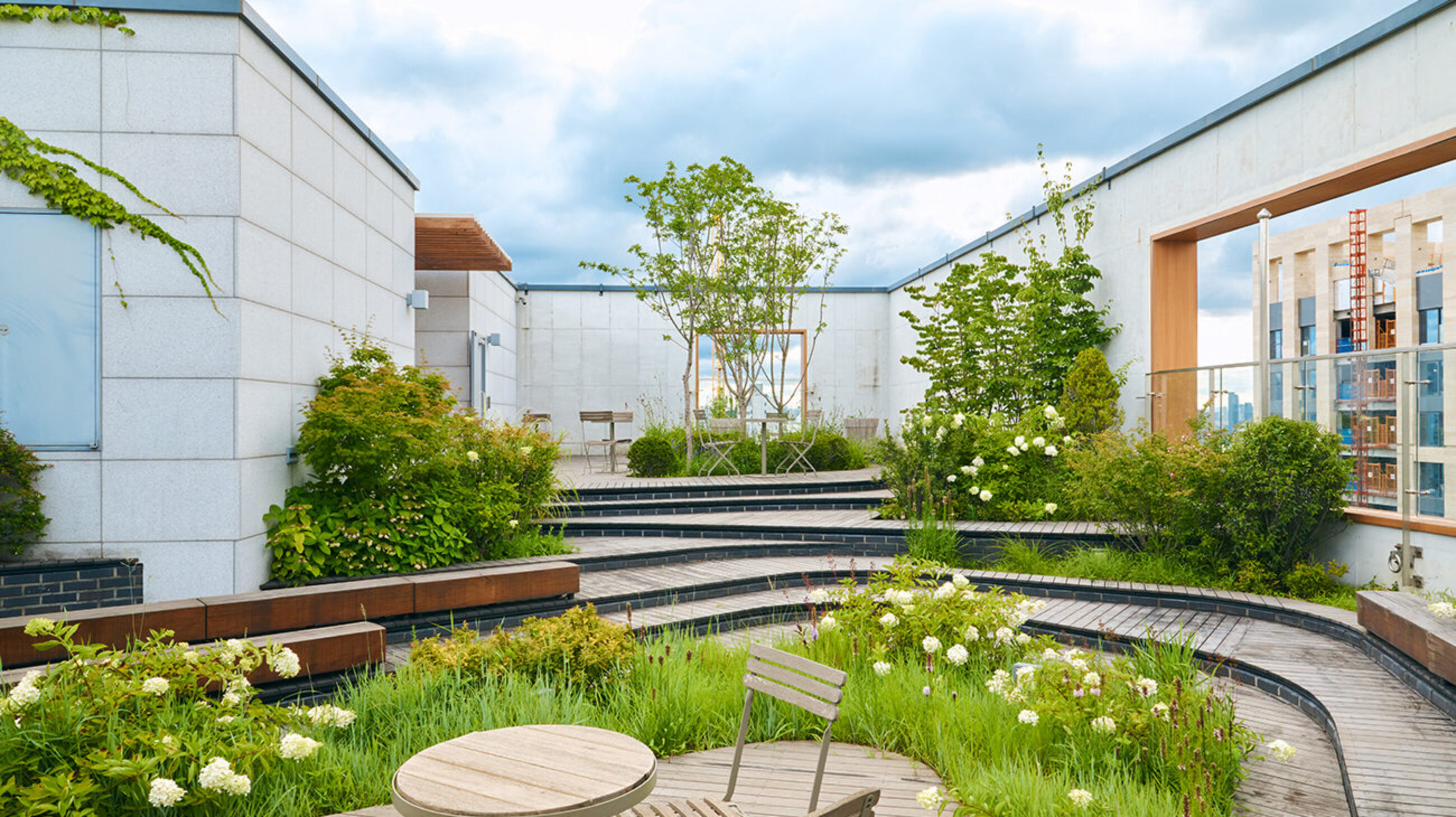 원형 탁자와 의자가 갖춰진 탁 트인 시야의 루프탑 가든