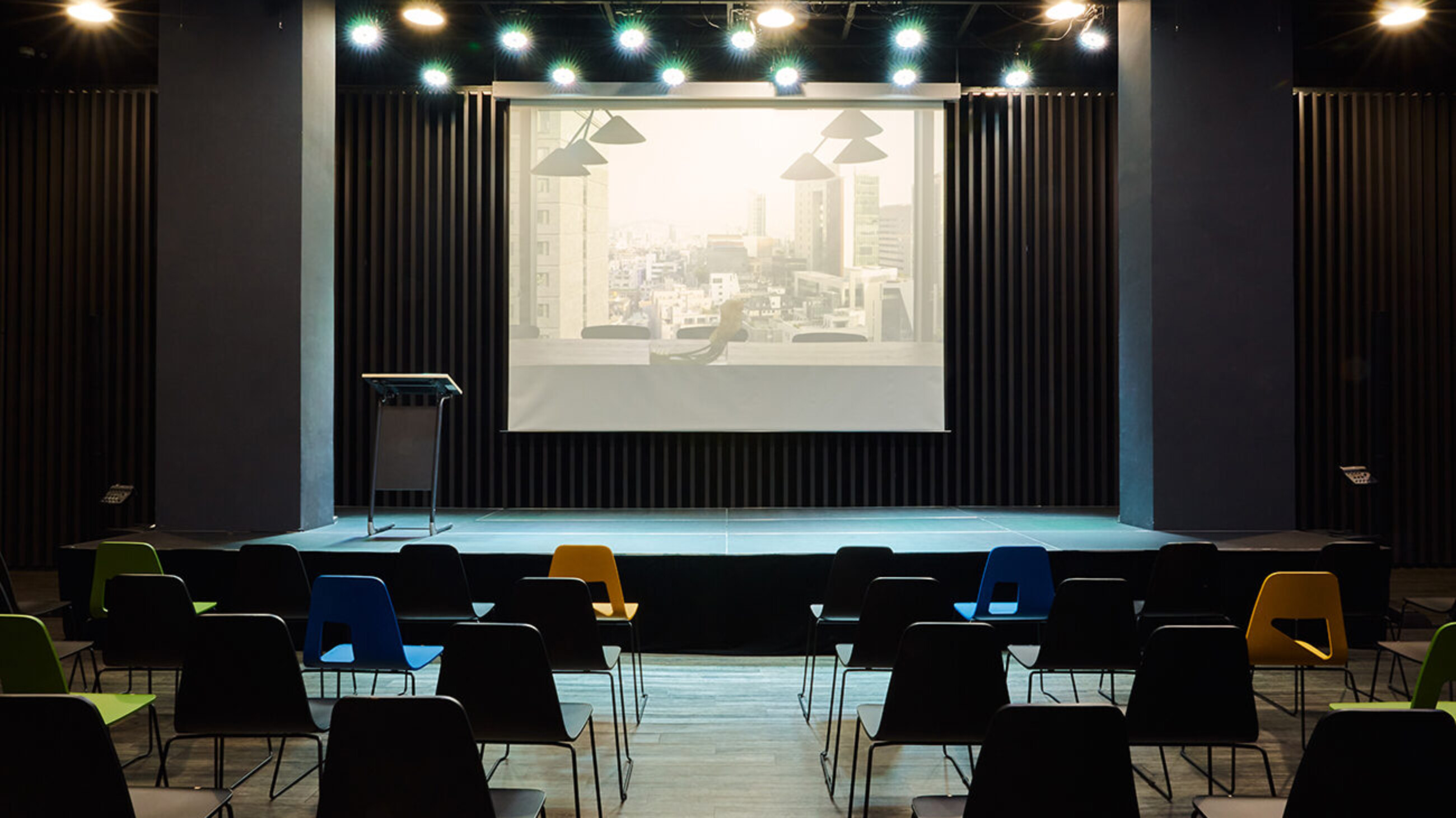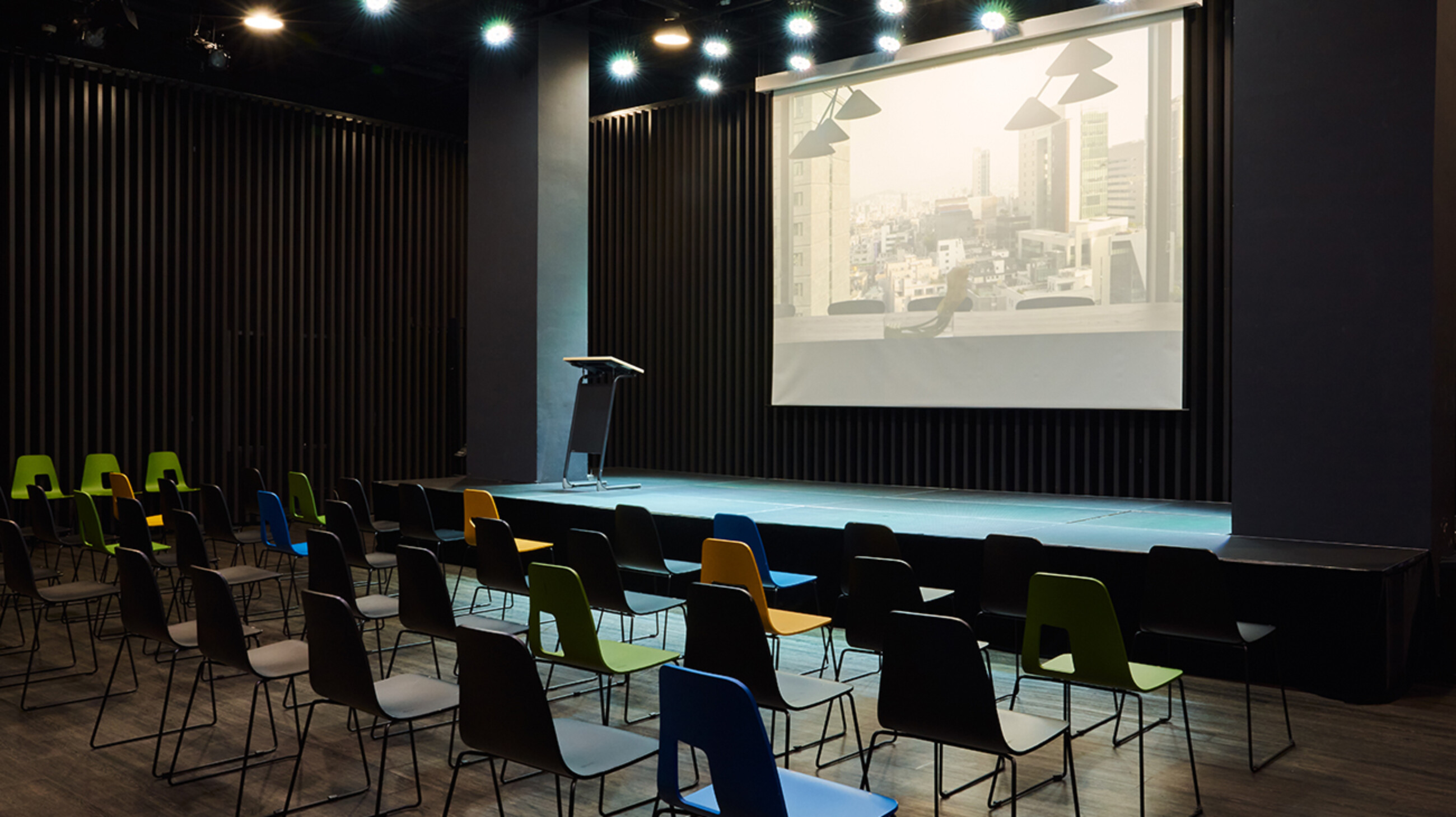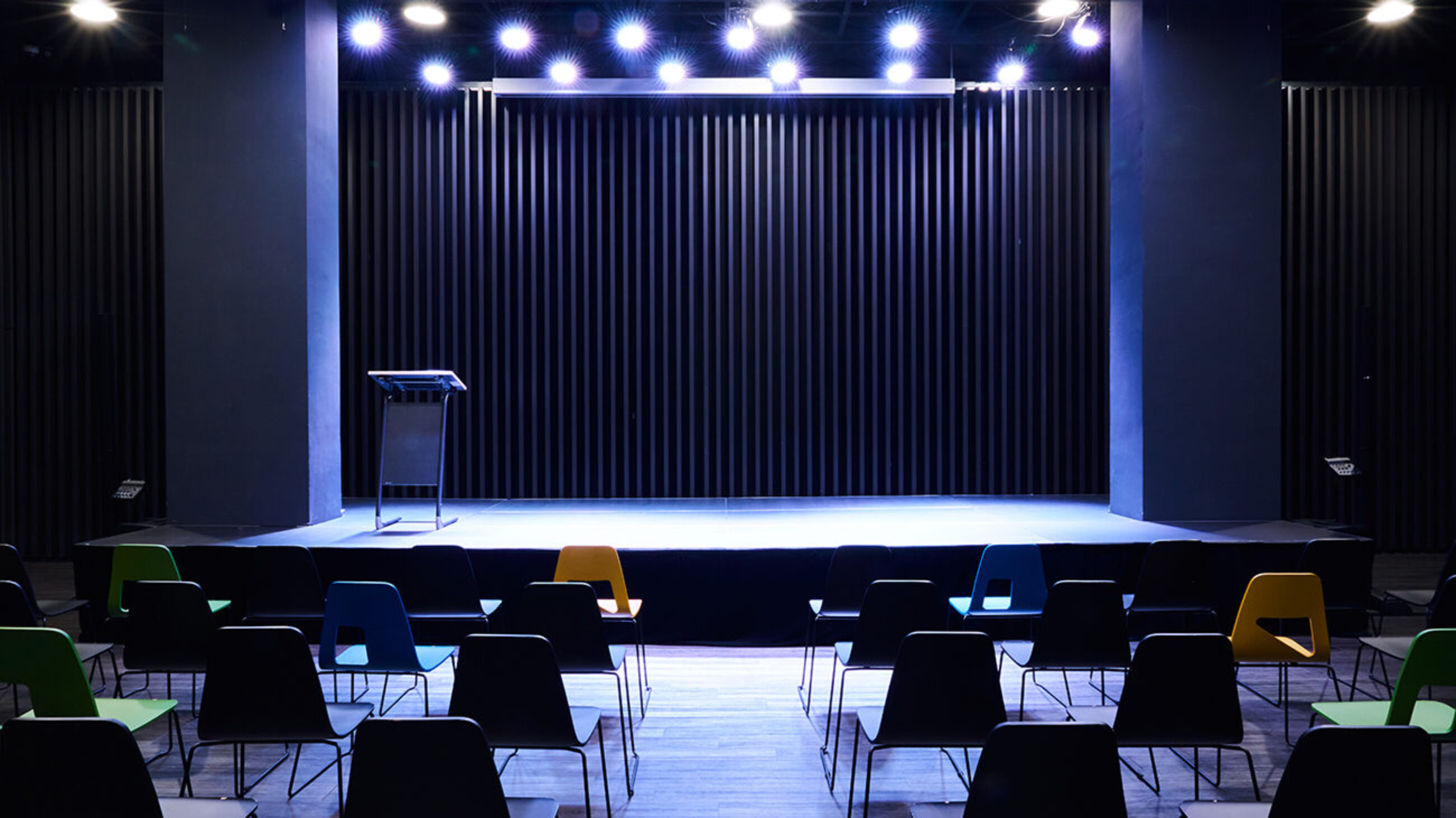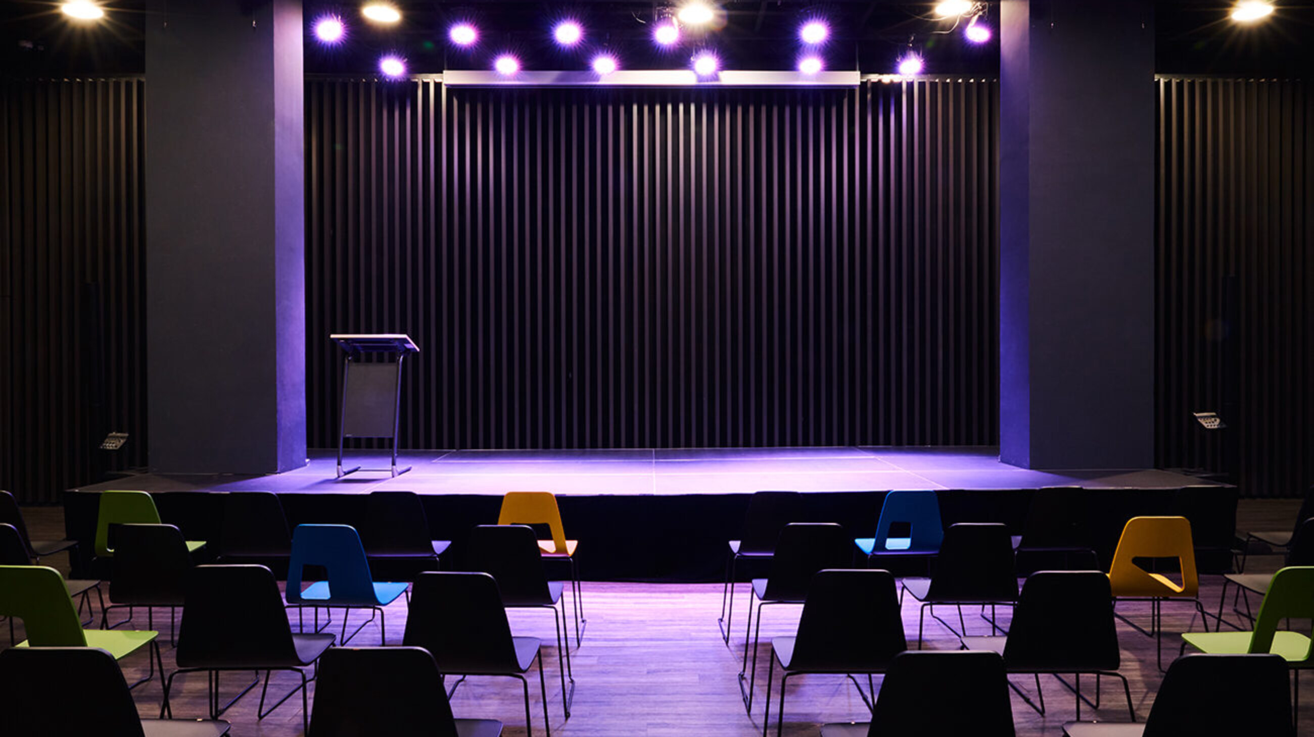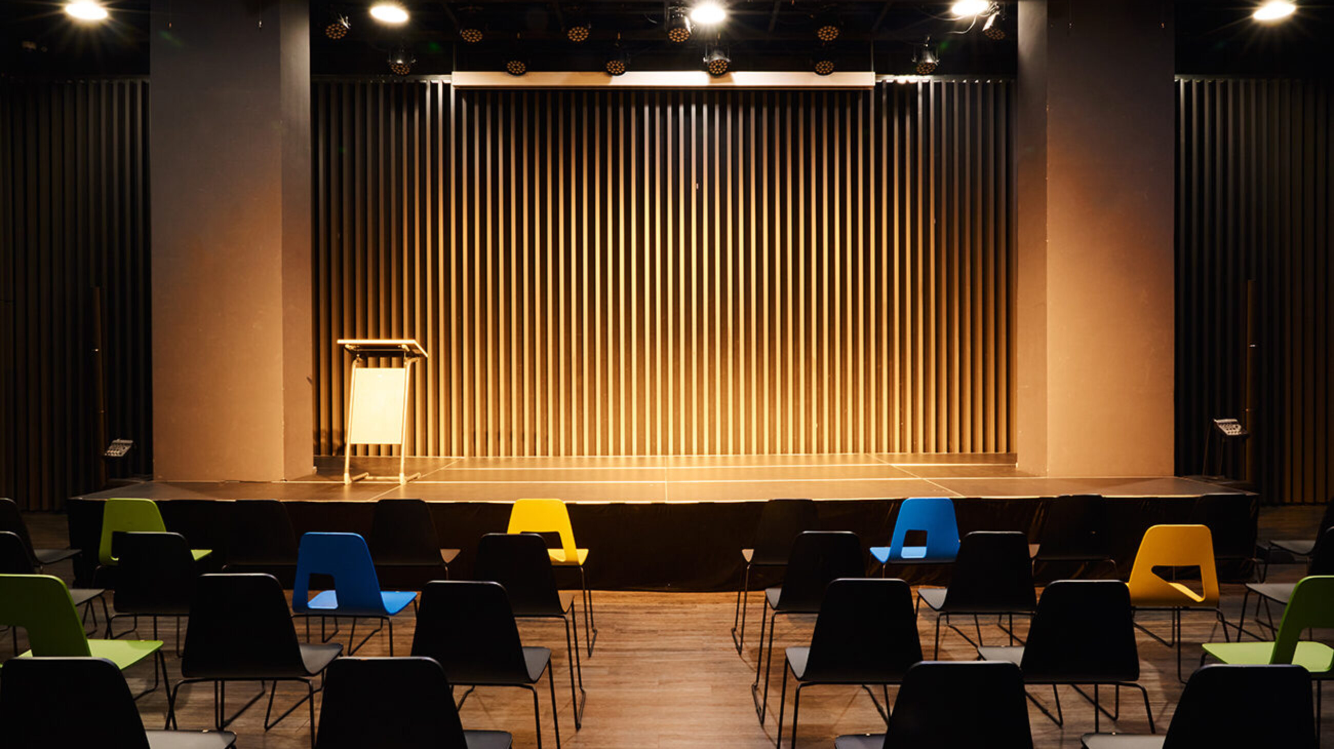 무대 장비와 음향 시설, 이동식 의자를 갖춘 홀